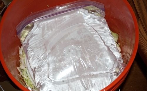 4. Что-нибудь тяжелое – это должно быть что-нибудь чистое. Некоторые рекомендуют камень, но я в своей жизни еще никогда не видела чистого камня, поэтому я использую закрывающийся пакет с водой и стеклянную банку с крышкой, наполненную водой. Их вы будете использовать, чтобы придавить внутреннюю крышку, которая должна быть покрыта рассолом.