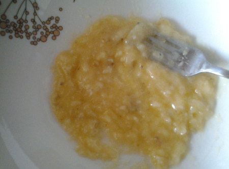 2. Добавьте 4 ложки майонеза. На картинке вы можете увидеть, что размятый банан выглядит слишком жидко. Всё это из-за того, что мы добавили к банану 4 ложки воды. Однако, как, оказалось, делать это крайне нежелательно.