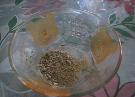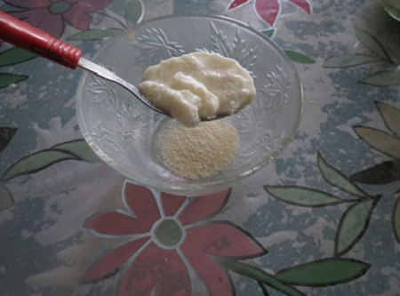 Постепенно добавляя в чашку розовую воду (если нет, то обычную) тщательно перемешивайте смесь пока не получите однородную сметанообрузную пасту.